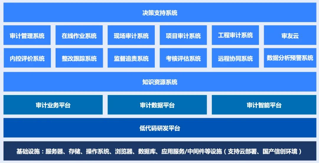 中建材審計(jì)系統(tǒng)是基于“審友新一代數(shù)智化審計(jì)平臺(tái)”交付。審友智審平臺(tái)為“1+3+N”總體架構(gòu)模式,包括”1個(gè)低代碼研發(fā)平臺(tái)、3個(gè)業(yè)務(wù)基礎(chǔ)支撐平臺(tái)(審計(jì)業(yè)務(wù)平臺(tái)、審計(jì)數(shù)據(jù)平臺(tái)、審計(jì)智能平臺(tái))、N個(gè)業(yè)務(wù)子系統(tǒng)“。具有“整體規(guī)劃、分步實(shí)施、快速見(jiàn)效、三化融合、可分可合、無(wú)縫銜接”的特點(diǎn)。